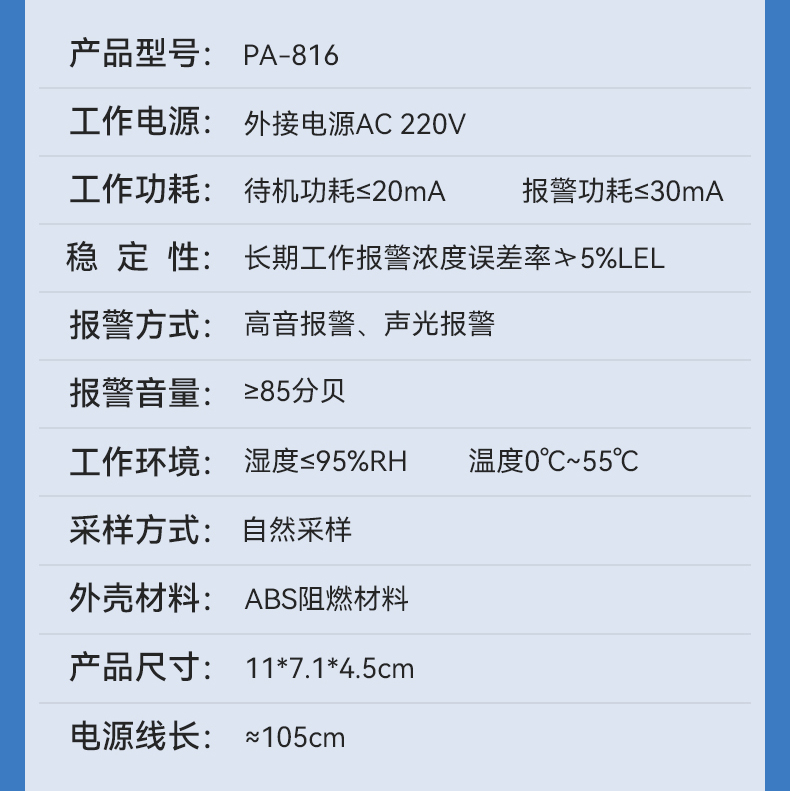 燃?xì)鈭缶?(型號PA-816) 產(chǎn)品規(guī)格 功能特點(diǎn) 資料下載 燃?xì)鈭缶?(型號PA-816)報警方式:高音報警、聲光報警工作電源:外接 電源AC220V故障自檢:泄露報警、正常工作、故障提醒多種氣體檢測平安保險85分貝高音量報警適用場景:適用于家庭廚房、酒店廚房、食堂、商場等場所