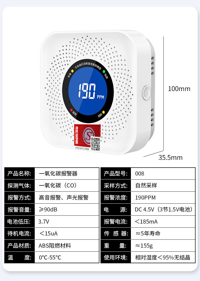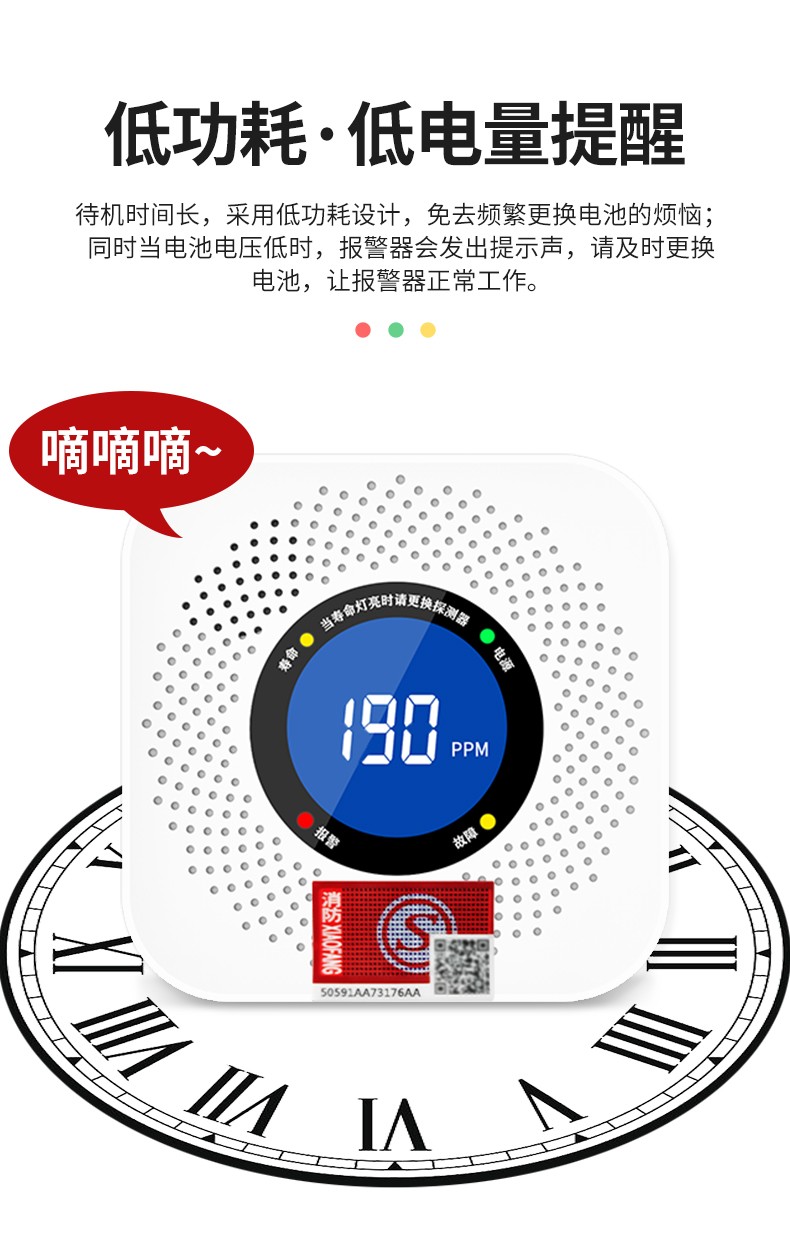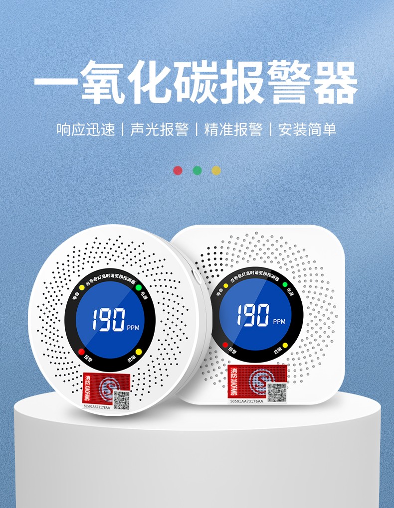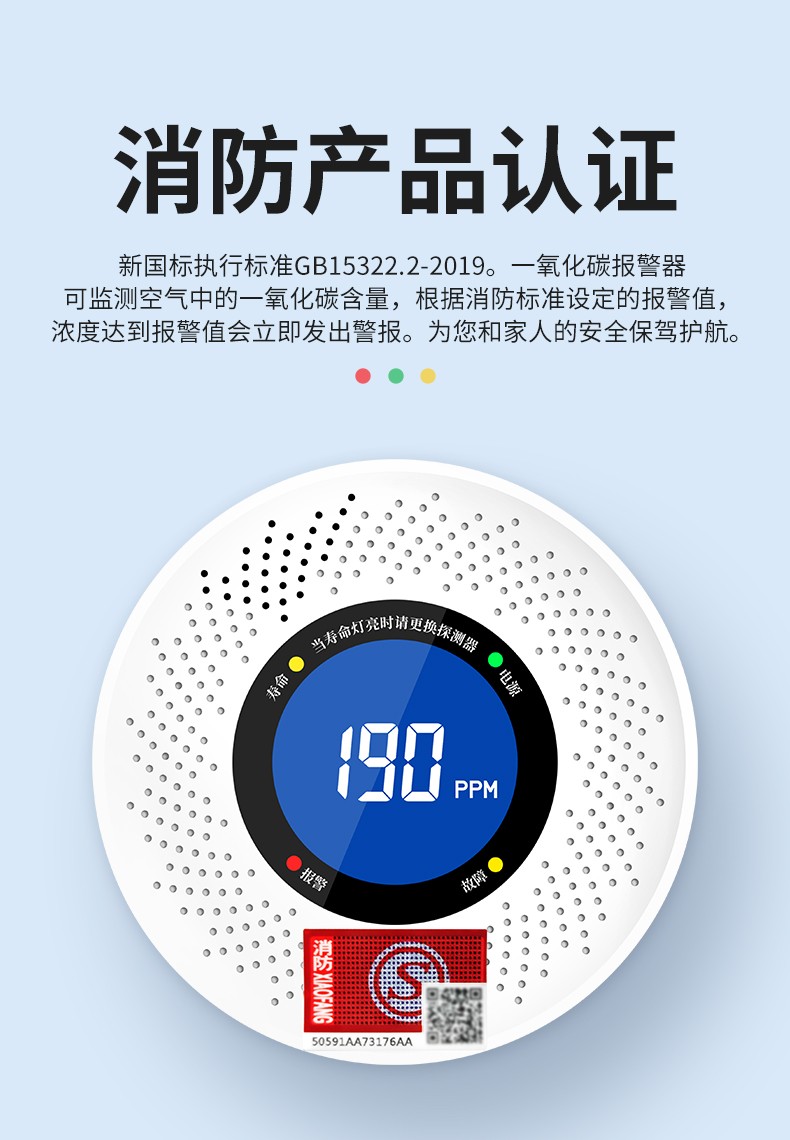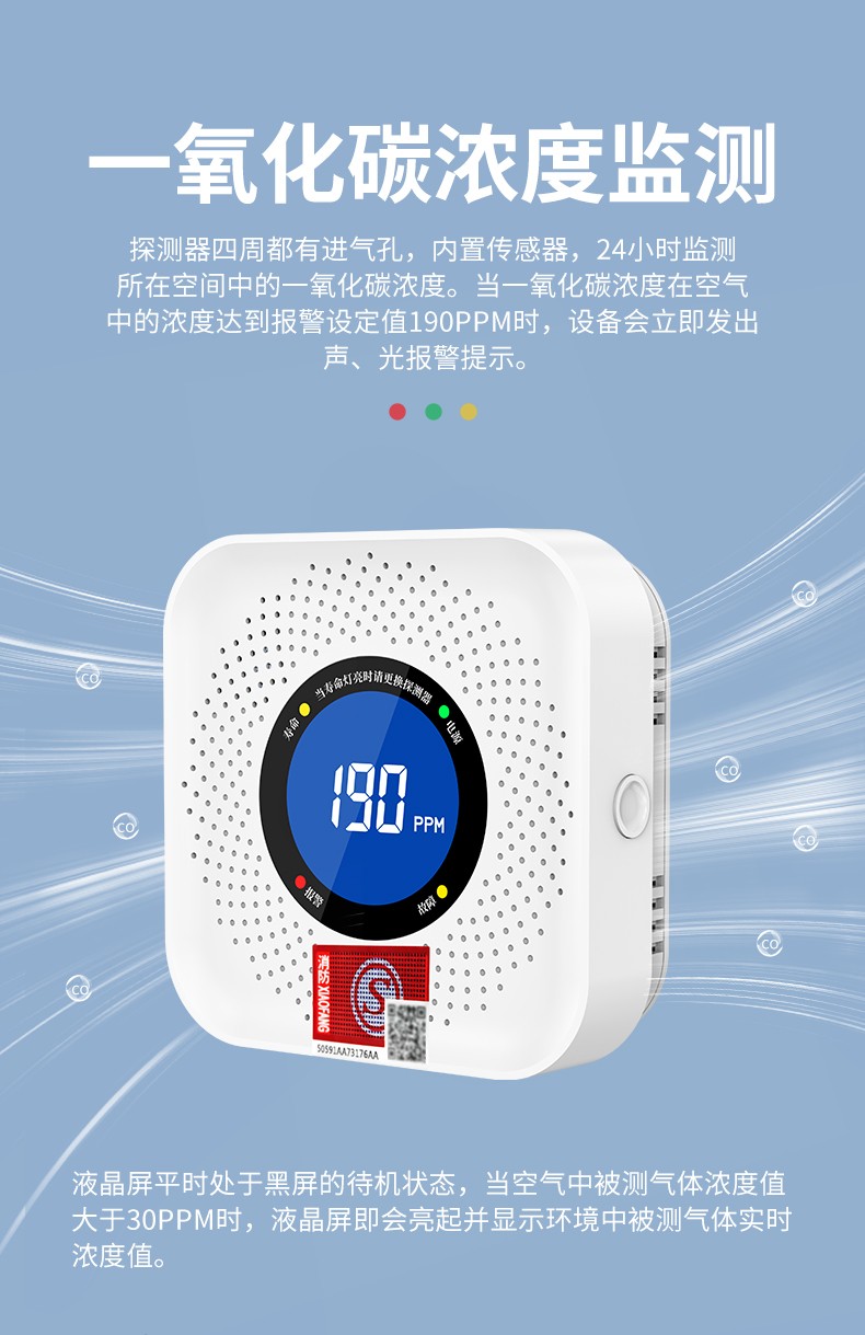 一氧化碳報警器(型號PA-008) 產(chǎn)品規(guī)格 功能特點 資料下載 一氧化碳報警器(型號PA-008)檢測氣體、燒煤、燒柴、燒炭、蜂窩媒、露營封閉環(huán)境、封閉車內(nèi)85分貝報警音量.LED液晶屏幕顯示故障自檢: 綠燈(正常)、黃燈 (故障、需要檢修) 紅燈(氣體濃度超標) 5.報警方式:蜂鳴聲提示 6. 產(chǎn)品保險:1000萬承險 7. ABS阻燃材質(zhì)適用場景:適用于廚房、浴室、起居室、火鍋包廂、飯?zhí)玫乳L時間空氣不流通的場所安裝一氧化碳報警探測器