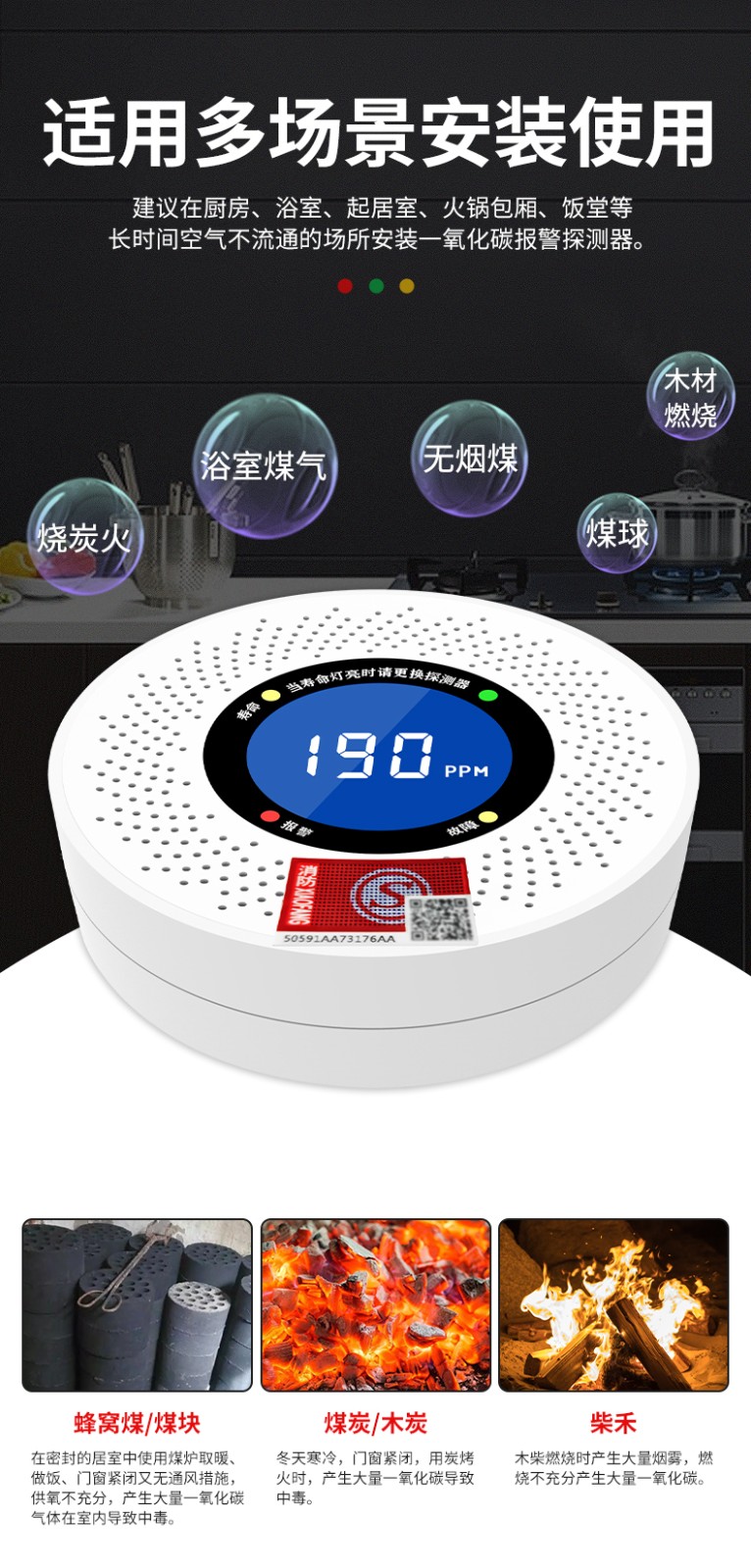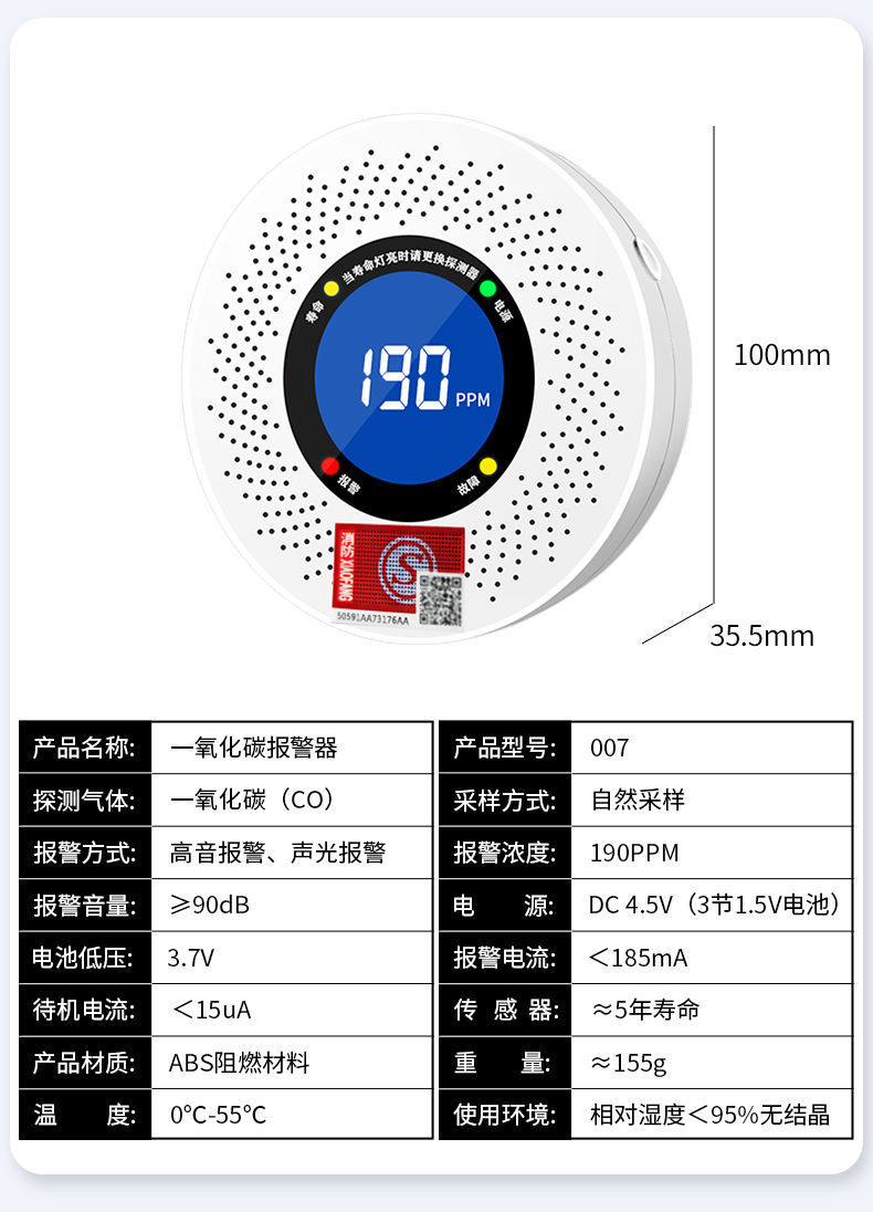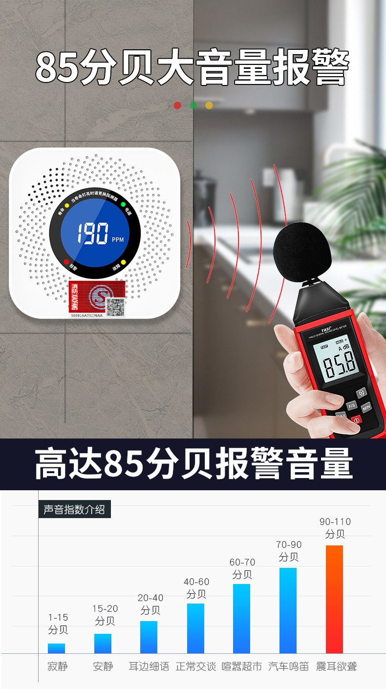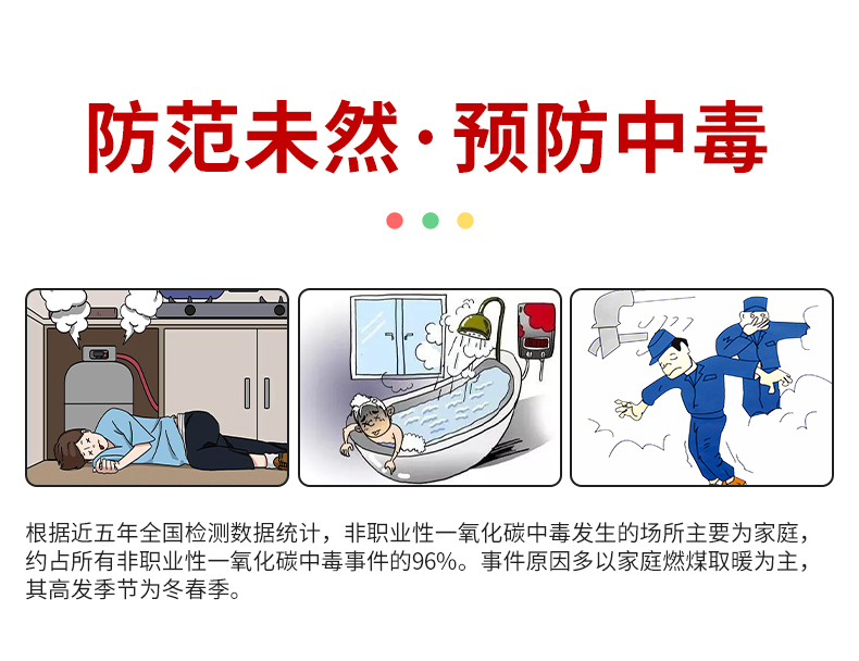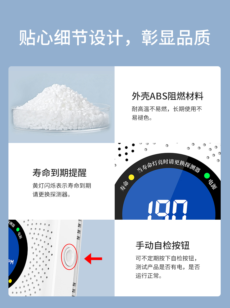 一氧化碳報警器(型號PA-008) 產(chǎn)品規(guī)格 功能特點 資料下載 一氧化碳報警器(型號PA-008)檢測氣體、燒煤、燒柴、燒炭、蜂窩媒、露營封閉環(huán)境、封閉車內(nèi)85分貝報警音量.LED液晶屏幕顯示故障自檢: 綠燈(正常)、黃燈 (故障、需要檢修) 紅燈(氣體濃度超標) 5.報警方式:蜂鳴聲提示 6. 產(chǎn)品保險:1000萬承險 7. ABS阻燃材質(zhì)適用場景:適用于廚房、浴室、起居室、火鍋包廂、飯?zhí)玫乳L時間空氣不流通的場所安裝一氧化碳報警探測器
