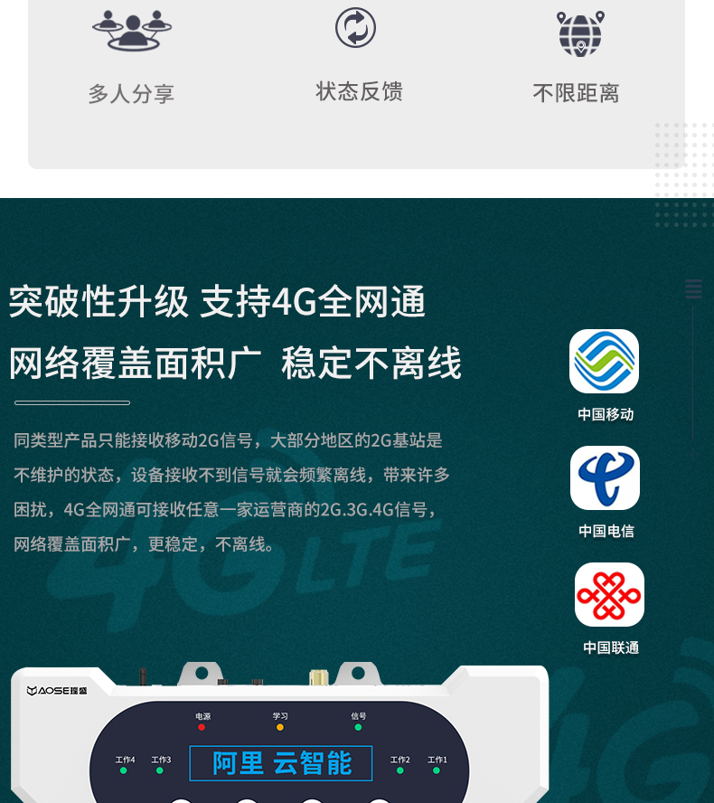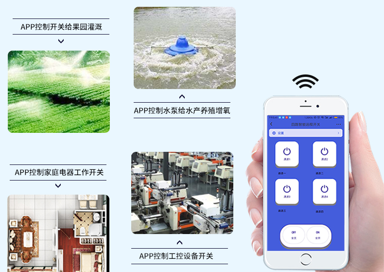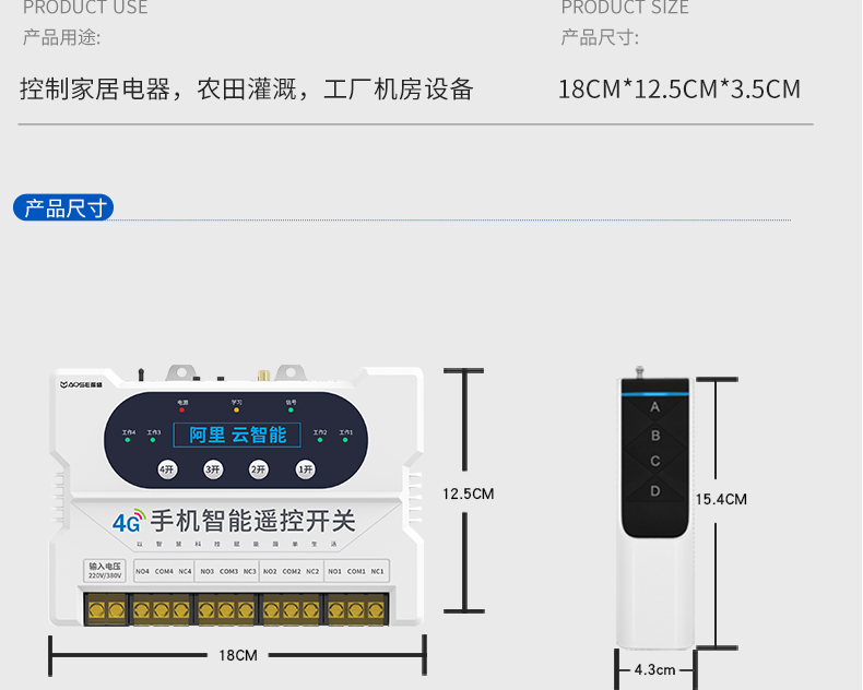 4G四路手機(jī)遠(yuǎn)程控制開關(guān)(A8系列) 產(chǎn)品規(guī)格 功能特點(diǎn) 資料下載 品名:GPRS手機(jī)遙控開關(guān)型號:YS-A8控制方式:手機(jī)APP/RF遙控/手動(dòng)控制傳輸方式:GPRS傳輸控制距離:無限距離,手機(jī)有信號就能控制;(RF遙控器4000米)工作電壓:220v、380v通用 產(chǎn)品尺寸:控制器182*125MM、遙控器136*43MM 用途:家電控制、農(nóng)田灌溉、工廠機(jī)房設(shè)備。多個(gè)控制器可在一個(gè)app上綁定控制!功能強(qiáng)大便捷!